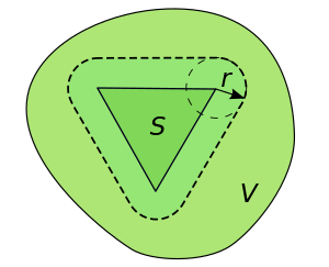 For the -neighbourhood of a set is the set of all points in that are at distance less than from (or equivalently, is the union of all the open balls of radius that are centered at a point in ):