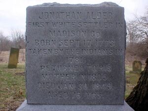 Jonathan Alder (September 17, 1773 – January 30, 1849)[1] was an American pioneer, and the first white settler in Madison County, Ohio.[2] As a young child living in Virginia, Alder was kidnapped by Shawnee Indians, and later adopted by a Mingo chief in the Ohio Country. He lived with the Native Americans for many years before returning to the white community.[3]