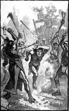 When the group reached the village, Alder learned why his life had been spared. One of the Mingo chiefs, Succohanos, and his wife, Whinecheoh, were an aging couple who had lost their son, and planned to adopt Alder as a replacement.[1][6] Alder was forced to run the gauntlet, as a rite of passage, and after he exhibited bravery during the trial, he was adopted and cared for by Whinecheoh. The Indians' other prisoner, Mrs. Martin, had been promised to a man in another village, and was taken away during Alder's adoption ceremony.[6]