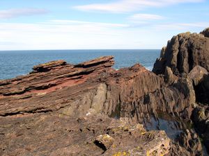 An eroded outcrop at Siccar Point showing sloping red sandstone above vertical greywacke was sketched by Sir James Hall in 1788.