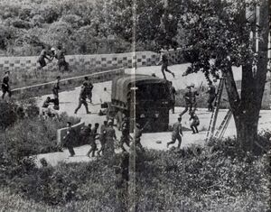 In addition, a 64-man task force of the ROK Army 1st Special Forces Brigade accompanied them, armed with clubs and trained in taekwondo, supposedly without firearms. However, once they parked their trucks near the Bridge of No Return, they started throwing out the sandbags that lined the truck bottoms and handing out M16 rifles and M79 grenade launchers that had been concealed below them.[4] Several of the commandos also had M18 Claymore mines strapped to their chests with the firing mechanism in their hands, and were shouting at the North Koreans to cross the bridge.[13][14]