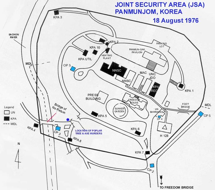 In the Joint Security Area, near the Bridge of No Return (through which the Military Demarcation Line runs), a 30-متر (98 ft) poplar tree blocked the line of sight between a United Nations Command (UNC) checkpoint and an observation post.[1]