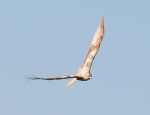 Red kites are 60 إلى 70 cm (24 إلى 28 in) long[14] with a 175–179 cm (69–70 in) wingspan; males weigh 800–1،200 g (28–42 oz), and females 1،000–1،300 g (35–46 oz).[3] It is an elegant bird, soaring on long wings held at a dihedral, and long forked tail, twisting as it changes direction. The body, upper tail and wing coverts are rufous. The white primary flight feathers contrast with the black wing tips and dark secondaries. Apart from the weight difference, the sexes are similar, but juveniles have a buff breast and belly. Its call is a thin piping sound, similar to but less mewling than the common buzzard. There is a rare white leucistic form accounting for approximately 1% of hatchlings in the Welsh population, but this variation confers a disadvantage in the survival stakes.[15]