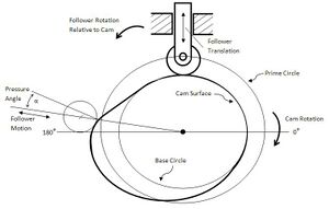 - ^ Introduction to Mechanisms – Cams "The follower moves in a plane perpendicular to the axis of rotation of the camshaft."