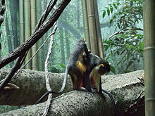 "Congo Gorilla Forest" is a 6.5-acre (2.6 ha) rainforest that is home to the 20 or so western lowland gorillas in the zoo. Colobus monkeys, guenon, marmosets,okapis, and mandrills also call this area home. Visitors walk through the area and can also view it from treetop lookouts.[18] Illustrations for this exhibit are by Jack Unruh.[بحاجة لمصدر]