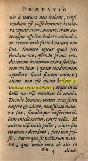 [...] Status hominum naturalis antequam in societatem coiretur, bellum fuerit; neque hoc simpliciter, sed bellum omnium in omnes.[10] كانت الحالة الطبيعية للبشر، قبل دخولهم المجتمع، حالة حرب مجردة، ولم تكن هذه مجرد حرب، بل حرب كل البشر ضد جميع البشر.[11]