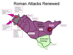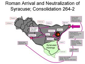 خريطة غرب البحر المتوسط، عام 264 ق.م. روما تظهر باللون الأحمر، وقرطاج باللون الرمادي، وسيراقوسة بالأخضر.