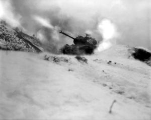 As an initial response to the invasion, Truman called for a naval blockade of North Korea, and was shocked to learn that such a blockade could be imposed only "on paper", since the U.S. Navy no longer had the warships with which to carry out his request.[80][81] Army officials, desperate for weaponry, recovered Sherman tanks from World War II Pacific battlefields and reconditioned them for shipment to Korea.[79] Army Ordnance officials at Fort Knox pulled down M26 Pershing tanks from display pedestals around Fort Knox in order to equip the third company of the Army's hastily formed 70th Tank Battalion.[82] Without adequate numbers of tactical fighter-bomber aircraft, the Air Force took F-51 (P-51) propeller-driven aircraft out of storage or from existing Air National Guard squadrons, and rushed them into front-line service. A shortage of spare parts and qualified maintenance personnel resulted in improvised repairs and overhauls. A Navy helicopter pilot aboard an active duty warship recalled fixing damaged rotor blades with masking tape in the absence of spares.[83]