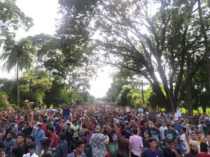 The Anti-discrimination Students Movement rejected the curfew.[47] In response to calls for the march to Dhaka, DMP Commissioner Habibur Rahman warned of zero tolerance, saying that firm legal action will be taken against those who violate the curfew.[48] It was reported that Hasina had been taken to a "safe shelter".[49] Up to 135 people were killed during protests that day.[50] Additionally, the resignation of Sheikh Hasina[51] accomplished the goal of the movement, which was to end the incumbent government's rule.