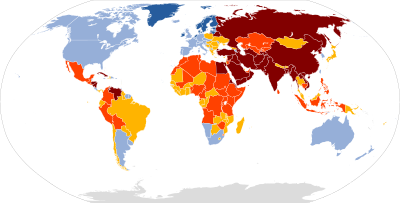 According to Reporters Without Borders, more than a third of the world's people live in countries where there is no press freedom.[15] Overwhelmingly, these people live in countries where there is no system of democracy or where there are serious deficiencies in the democratic process.[16]