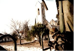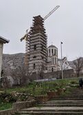 Mostar was heavily damaged by JNA shelling during the siege. Amongst the destroyed or severely damaged buildings were the Catholic Cathedral of Mary, Mother of the Church, the Franciscan Church and Monastery, the Bishop's Palace (with a library collection of over 50,000 books), 12 out of 14 mosques, the historical museum, archives, and number of other cultural institutions. All of the city's bridges were destroyed, leaving only the Stari Most bridge as the remaining river crossing. In mid-June 1992, after the battle line moved eastward, the HVO demolished the Serbian Orthodox Žitomislić Monastery, while the Cathedral of the Holy Trinity was burned by an unidentified group.[27] The JNA was accused of harassing non-Serbs and looting/burning the property of Bosniaks and Croats.[28] About 90,000 of Mostar's 120,000 residents fled.[29] Thousands of Bosniaks that left Mostar during the siege began to return into the city. They were followed by many Bosniak refugees from other Bosnian towns which had been overrun by the VRS.[30]