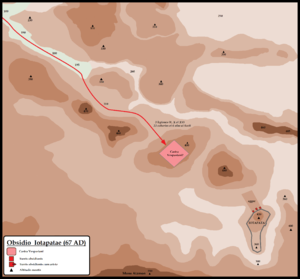 حصار يودفات (بالعبرية: יוֹדְפַת، وتُسمى يوتاپاتا Jotapata, Iotapata) كان حصاراً لمدة 47 يوماً فرضته القوات الرومانية على البلدة اليهودية يودفات وقع في عام 67 م، أثناء الثورة الكبرى. بقيادة الجنرال الروماني ڤسپاسيان وابنه تيتوس, both future emperors, the siege ended with the sacking of the town, the deaths of most of its inhabitants and the enslavement of the rest. It was the second bloodiest battle of the revolt, surpassed only by the حصار القدس، and the longest except for Jerusalem and ماسادا. The siege was chronicled by يوسفوس، who had personally commanded the Jewish forces في يودفات and was subsequently captured by the Romans.[2]