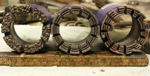 The most commonly used RC drill bits are 5-8 inches (13-20 cm) in diameter and have round metal 'buttons' that protrude from the bit, which are required to drill through shale and abrasive rock. As the buttons wear down, drilling becomes slower and the rod string can potentially become bogged in the hole. This is a problem as trying to recover the rods may take hours and in some cases weeks. The rods and drill bits themselves are very expensive, often resulting in great cost to drilling companies when equipment is lost down the bore hole. Most companies will regularly re-grind the buttons on their drill bits in order to prevent this, and to speed up progress. Usually, when something is lost (breaks off) in the hole, it is not the drill string, but rather from the bit, hammer, or stabiliser to the bottom of the drill string (bit). This is usually caused by a blunt bit getting stuck in fresh rock, over-stressed metal, or a fresh drill bit getting stuck in a part of the hole that is too small, owing to having used a bit that has worn to smaller than the desired hole diameter.