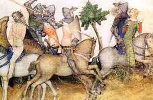 نقش خشبي من الطبعة الثانية لوليام كاكستون من حكايات كانتربري طبعت في عام 1483 | |