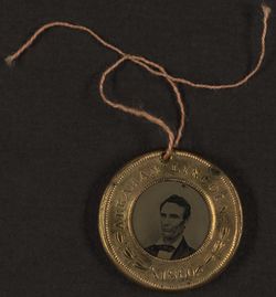 أزرار الحملة الرئاسية لـ ابراهام لنكون، 1860. The reverse side of the button shows a portrait of his running mate هانيبال هاملن.