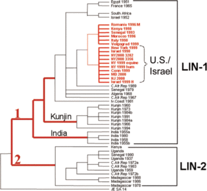 - ^ Lanciotti RS, Ebel GD, Deubel V, et al. (June 2002). "Complete genome sequences and phylogenetic analysis of West Nile virus strains isolated from the United States, Europe, and the Middle East". Virology. 298 (1): 96–105. doi:10.1006/viro.2002.1449. PMID 12093177.
