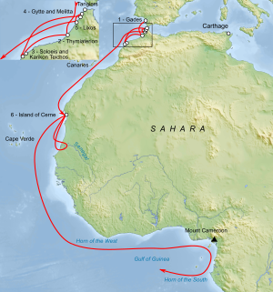 The name Hanno was given to many other Carthaginians. Ancient authors who discussed Hanno the Navigator did not provide direct information to identify him exactly. Some called him king, and others used the Latin words dux (leader or general) or imperator (commander or emperor).[4] The Greek translation of Hanno's periplus account names him a basileus,[5] a term which may be interpreted as "king", but was commonly used for high-level Carthaginian officials.[6]
