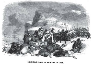In the winter of 1770–1771, Ubashi Khan, the great-grandson of Ayuka Khan and the last Kalmyk Khan, decided to return his people to their ancestral homeland, Dzungaria, then under control of the Qing dynasty.[6] The Dalai Lama, contacted to request his blessing and to set the date of departure, consulted the astrological chart and set the return date, but at the moment of departure, the weakening of the ice on the Volga River permitted only those Kalmyks who roamed on the eastern bank to leave. Those on the right bank were forced to stay behind.