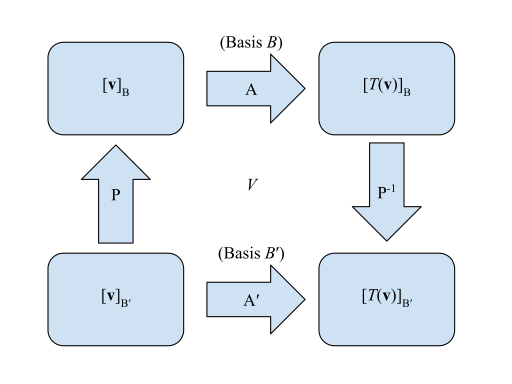 Given a linear map which is an endomorphism whose matrix is A, in the basis B of the space it transforms vector coordinates [u] as [v] = A[u]. As vectors change with the inverse of B (vectors are contravariant) its inverse transformation is [v] = B[v'].