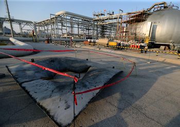 فجوة في أحد الخزانات الكروية في أبقيق، السعودية، 16 سبتمبر، 2019.
