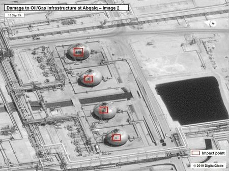 أربع خزانات كروية لأرامكو مصابة، في أبقيق، السعودية. سبتمبر 2019.