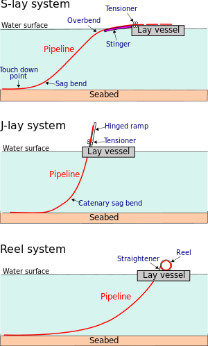 Simplified drawings of three common systems used for the construction and installation of subsea pipelines (not to scale): S-lay, J-lay and reel.