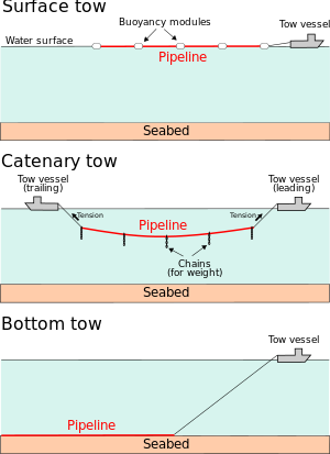 Simplified drawings showing three configurations used to tow subsea pipelines offshore to the planned installation site (not to scale).