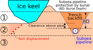 One of a number of reasons why submarine pipelines are buried below the seabed: to protect them against the gouging action of drifting ice features, such as icebergs.