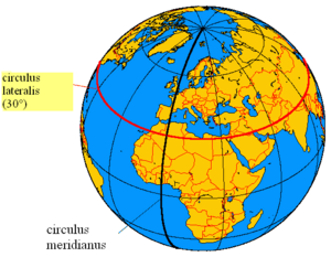 خط زوال گرينتش هو خط الزوال الرئيسي، الذي هو خط مرجع جغرافي يمر خلال المرصد الملكي، گرينتش، في لندن، إنجلترة.[1] From 1884 to 1974, the Greenwich meridian was the international standard prime meridian, used worldwide for timekeeping and navigation. The modern standard, the IERS Reference Meridian, is based on the Greenwich meridian, but differs slightly from it.[1] This prime meridian (at the time, one of many) was first established by Sir George Airy in 1851, and by 1884, over two-thirds of all ships and tonnage used it as the reference meridian on their charts and maps. In October of that year, at the invitation of the President of the United States, 41 delegates from 25 nations met in Washington, D.C., United States, for the International Meridian Conference.[2] This conference selected the meridian passing through Greenwich as the world standard prime meridian due to its popularity.[أ] However, France abstained from the vote, and French maps continued to use the Paris meridian for several decades. In the 18th century, London lexicographer Malachy Postlethwayt published his African maps showing the "Meridian of London" intersecting the Equator a few degrees west of the later meridian and Accra, Ghana.[4]