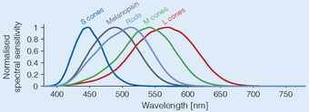 تشير معظم الأعمال إلى أن حساسية الذروة الطيفية للمستقبل تتراوح بين 460 و 484 نانومتر. لوكلي وآخرون في عام 2003 [17]أظهر أن الطول الموجي 460 نانومتر (الازرق) من الضوء تكبح الميلاتونين ضعف ما يصل إلى 555 نانومتر ضوء(أخضر) ، حساسية الذروة للنظام البصري الضوئي. في عمل زيدي ولوكلي ومؤلفين مشاركين باستخدام إنسان بلا عصوي او مخروطي ، وجد أن منبه كثافته عالية جدًا 481 نانو متر أدى إلى بعض الإدراك الواعي للضوء ، مما يعني أن بعض الرؤية البدائية قد تحققت..[7]
