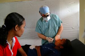 Surgical extractions involve the removal of teeth that cannot be easily accessed or removed via simple extraction, for example because they have broken under the gum or because they have not erupted fully, such as an impacted wisdom tooth.[1] Surgical extractions almost always require an incision. In a surgical extraction the dentist may elevate the soft tissues covering the tooth and bone, and may also remove some of the overlying and/or surrounding jaw bone with a drill or, less commonly, an instrument called an osteotome. Frequently, the tooth may be split into multiple pieces to facilitate its removal.