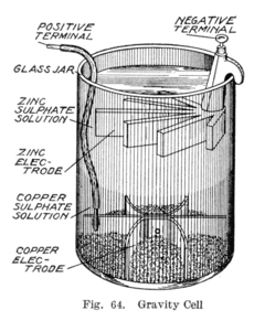 Sometime during the 1860s, a Frenchman by the name of Callaud invented a variant of the Daniell cell which dispensed with the porous barrier.[11] Instead, a layer of zinc sulfate sits on top of a layer of copper sulfate, the two liquids are kept separate by their differing densities, often with a layer of oil added on top to prevent evaporation. This reduces the internal resistance of the system and thus the battery yields a stronger current.