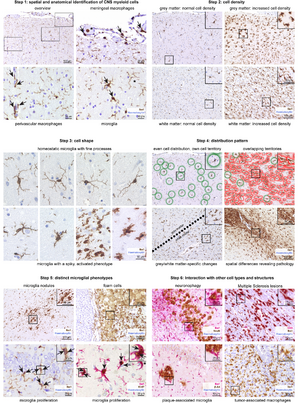 - ^ أ ب ت ث Schwabenland M, Brück W, Priller J, Stadelmann C, Lassmann H, Prinz M (December 2021). "Analyzing microglial phenotypes across neuropathologies: a practical guide". Acta Neuropathologica (published October 2021). 142 (6): 923–936. doi:10.1007/s00401-021-02370-8. PMC 8498770. PMID 34623511. قالب:CC-notice