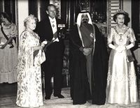 الملكة إليزابث الثانية ملكة بريطانيا، أثناء استقبالها للشيخ خليفة بن حمد آل ثاني في قصر باكنگهام ويظهر في الصورة الأمير فيليب والملكة الأم.