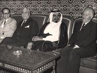 لشيخ خليفة بن حمد آل ثاني في الجامعة العربية يتوسط عبد الخالق حسونة، الأمين العام للجامعة العربية والدكتور حسن كامل مستشار حكومة قطر. أثناء زيارته لمصر من 5-8 يونيو عام 1971.