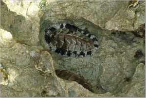 Lined chiton, Tonicella lineata. The anterior end of the animal is to the right | |