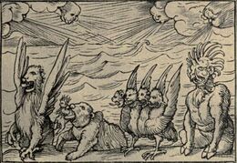 - الأسد: بابل. تحوله إلى رجل يعكس تحول نبوخذنصر إلى وحش في الفصل 4، وقد يعكس "العقل البشري" استعادته لعقله؛ تعكس "الأجنحة المقطوعة" فقدان القوة والتحول إلى حالة إنسانية.