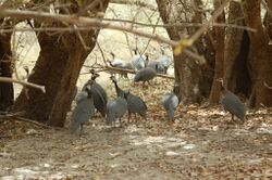 Helmeted guineafowl are often domesticated, and it is this species that is sold in Western supermarkets. Feral populations descended from domestic flocks are now widely distributed and occur in the West Indies, North America, Australia and Europe.[2]
