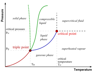 يمثل الخط الأزرق غليان الماء وتحوله إلى بخار، حيث تكون الحالتان موجودتان كالمعتاد ومنفصلتان. بإرتفاع الضغط ترتفع درجة حرارة الغليان وبالعكس عندما ينخفض الضغط تنخفض تبعا درجة الغليان. وطالما نتحرك على الخط الأزرق يكون لدينا حالتين (ماء وبخار) في حالة توازن ، أي ماء يغلى وفوقه بخار ساخن يتبخر بمعدل معين. ومع استمرار رفع الضغط ترتفع بالتالي درجة الغليان حتي نصل إلى نقطة تسمى النقطة الحرجة (critical point) ، وعندها نصل إلى حالة لا يكون فيها الماء سائلا ولا بخارا، بل هي حالة تجمع بين الاثنين في مخلوط مشبع من الماء والبخار عالي الضغط والحرارة . وتبلغ النقطة الحرجة للماء عند درجة حرارة 647 كلفن ( 374 درجة مئوية) وتتسم تلك النقطة أيضا بضغط حرج ، وهي للماء عند 218 ضغط جوي.