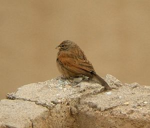 The house bunting has recently been split from the closely related striolated bunting,[3][4] of which it used to be treated as a subspecies, Emberiza striolata sahari. The striolated bunting has stronger facial striping and a paler belly than the house bunting.[2]