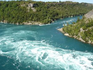About three miles (4.8 kilometers) downstream from Niagara Falls is the Niagara Whirlpool. Located mostly in Canada and partially in the United States, the whirlpool is crossed by the Whirlpool Aero Car.[12]