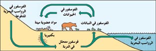 تمد تجوية الفوسفات، الذي رُفِعَ فوق مستوى البحر، التربة بالفوسفات. وتمتص النباتات الفوسفات المتحلل من التربة. ويحصل البشر والحيوانات الأخرى على الفوسفور من النباتات والحيوانات التي يأكلونها. وبعد أن تموت النباتات والحيوانات، تقوم بكتيريا معينة بتدمير المادة العضوية للميت، وتعيد الفوسفور للتربة. وقد تعيد الكائنات العضوية الفوسفور عدة مرات قبل أن تُجرف نهائيًاً إلى البحر، وتقع مرة أخرى في فخ الرواسب البحرية. وأخيراً، ترفع القوى الجيولوجية البطيئة جداً بعض هذه الرواسب، لتبدأ دورة أخرى..