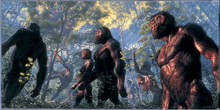 وعلى النقيض من ذلك، لا تكون القردة العليا اقتصادية حين تتحرك على الأرض. وعلى سبيل المثال، فإن الشمپانزات، التي تستخدم شكلا غريبا من المشي الرباعي الأقدام يعرف باسم المشية البرجمية(4) knuckle walking، تصرف من الكالوريات في أثناء المشي ما يفوق نحو 35 في المئة ما يصرفه حيوان ثديي نموذجي رباعي الأقدام من نفس الحجم (كلب كبير مثلا). وقد تفيد فروق الأوضاع التي تَطور عبرها البشر والقردة العليا في تفسير الاختلاف في تكاليف الحركة لديهما. فالشمپانزات والغوريلات والأورانگوتانات نشأت في الغابات الكثيفة وواصلت العيش في هذه الغابات، حيث لا يلزمها أكثر من ميل أو نحو ذلك من التجوال في مشوار النهار حتى تصيب ما يكفيها لتأكله. وبالمقابل، حدث الكثير من التطور الباكر للأناسي في أراض حرجية ومروج مكشوفة كانت فيها الحياة والأقوات أقسى منالا. وفي الحقيقة، إن البشر الحديثين الذين يعيشون على الصيد وجمع الغذاء في هذه البيئات، والذين يزودوننا بأفضل نموذج متاح عن أنماط المعيشة البشرية القديمة، غالبا ما يجوبون خمسة إلى ثمانية أميال يوميا سعيا وراء الطعام.