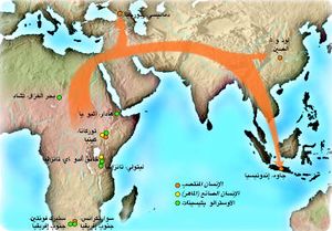 وكذلك ترافق نشوء الإنسان المنتصب في إفريقيا قبل 1.8 مليون سنة مع نقطة انعطاف ثالثة في التطور البشري. فحتى عهد قريب، كانت مواضع وجود أحافير معروفة، وأعمارها، توحي بأن الأفراد المبكرين من جنس الإنسان «هومو» استقروا ثابتين بضع مئات من آلاف السنين قبل أن يغامروا بالخروج من موطنهم وينتشروا ببطء في سائر أرجاء العالم القديم. وقد ألمحت مؤلفات سابقة إلى أن التحسينات في تقانة صنع الأدوات قبل نحو 1.4 مليون سنة (أي تداول الفأس الأشولية(7) Acheulean اليدوية) سمحت للأناسي بمغادرة إفريقيا.