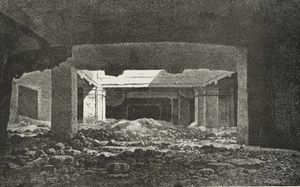 يفضي المدخل إلي صالة مستديرة يتوسطها بئر قطره (8.5م) يعلوه سقف علي شكل قبة وترتكز القبة علي 6 أعمده ويصل بين كل عمود وآخر (حوائط الستائر) فيما عدا الجزء المواجه للمدخل. والجزء الداخلي لهذه الحوائط ذو زخارف هندسية ملونة باللون الأحمر. وقد عثر في قاع البئر علي خمسة رؤوس رخامية معروضة الآن بالمتحف اليوناني الروماني (رأس لأحد كهنه سيراميس – رأس شاب – رأس صبي – رأس طفل صغير) أما الرؤوس الموجودة علي حافة الحائط المستدير المحيط بالبئر فهي نماذج لها صنعت من الحصي وهناك شك فيما إذا كانت هذه التماثيل تنتمي إلى نفس المقبرة أو إلي مبني آخر. وطريقة نحت هذه التماثيل -خاصة العينان والشعر- تدل علي أنها ترجع إلى الفترة من آخر القرن الأول الميلادي إلى النصف الثاني من القرن الثاني الميلادي.