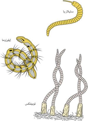 أكثرها انتشاراً الدودة إيلوزوما Aeolosoma (الشكل 5) التي تحتوي على أصبغة حمراء أو بيضاء وحزمة من الأشعار، وهي بطول نحو 1مم. وهناك الدودة من الجنس ستيلاريا Stylaria التي يصل طولها إلى ما بين 10 و25مم، والدودة توبيفِكس Tubifex الحمراء اللون التي تعيش ورأسها منطمر في طين القاع ويتموج ذيلها في الماء، ويراوح طولها بين 10و15مم.