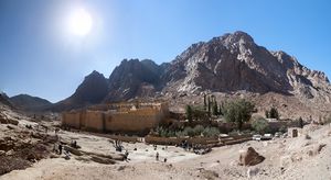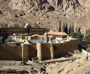 دير سانت كاترين حيث تظهر قمة رأس الصفصافة (التي تعتبر تقليدياً جبل حوريب التوراتي) في الخلفية.