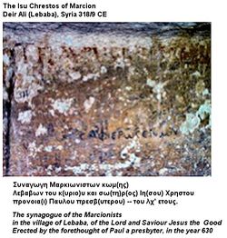 - ^ فيليپ لو با و وليام هنري وادنگتن، Greek Inscriptions grecques et latines recueillies en Grèce et en Asie Mineure (1870), volume 3, inscription 2558. Minor reference in گرهارد كتل، Theological Dictionary of the New Testament، تحت Synagogue. أيضاً مشار إليه عرَضاً في مقالة الموسوعة الكاثوليكية حول Marcionites, مستخدما لو با و وادنگتن كمراجع