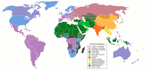 Christianity | 2,000–2,200 | [33] | Abrahamic religions | Predominant in the Western world (Western Europe, the Americas, Oceania), Eastern Europe, Russia, Sub-Saharan Africa, the Philippines, and East Timor in Southeast Asia. Minorities worldwide, see Christianity by country. |