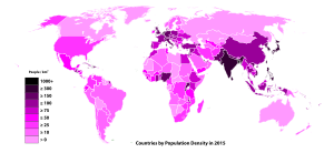 The world's population is 7 billion[27] and Earth's total area (including land and water) is 510 million square kilometers (197 million square miles).[28] Therefore, the worldwide human population density is 7 billion ÷ 510 million = 13.7 per km² (35.5 per sq. mile). If only the Earth's land area of 150 million km² (58 million sq. miles) is taken into account, then human population density increases to 46.7 per km² (117.2 per sq. mile). This calculation includes all continental and island land area, including Antarctica. If Antarctica is also excluded, then population density rises to 50 people per km² (129.28 per sq. mile).[29] Considering that over half of the Earth's land mass consists of areas inhospitable to human inhabitation, such as deserts and high mountains, and that population tends to cluster around seaports and fresh water sources, this number by itself does not give any meaningful measurement of human population density.